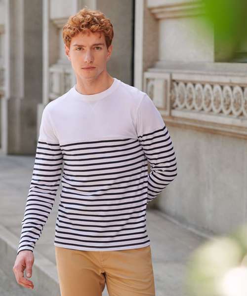 Tag-free regular fit, heavyweight long-sleeved t-shirt. Crew neck with stretch ribbed neckline. Twin-needle stitching at cuffs and hem. 'V' flatlock stitching detail at neck. Flatlock stitching at neck, shoulder seam and armholes. High chest and upper arm seams. Striped lower body and sleeves; contrast plain upper body and sleeves.